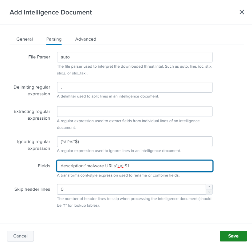 In the Parsing screen enter a transforms.conf expression to extract the fields corresponding to the threat lookups you’re looking to populate.