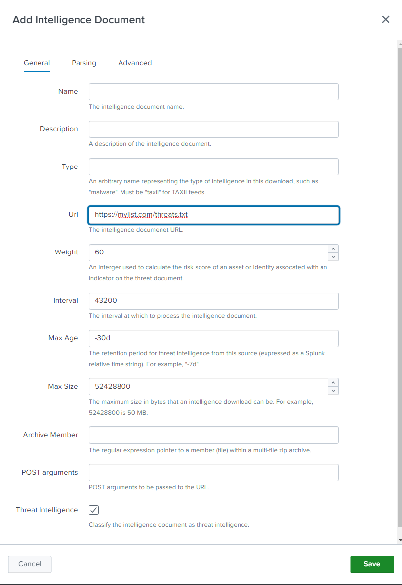 In the Parsing screen enter a transforms.conf expression to extract the fields corresponding to the threat lookups you’re looking to populate.